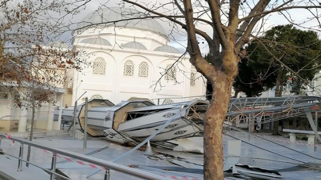 İzmir'in Dikili ilçesinde etkili olan şiddetli fırtına nedeniyle bir caminin minaresi yıkıldı.