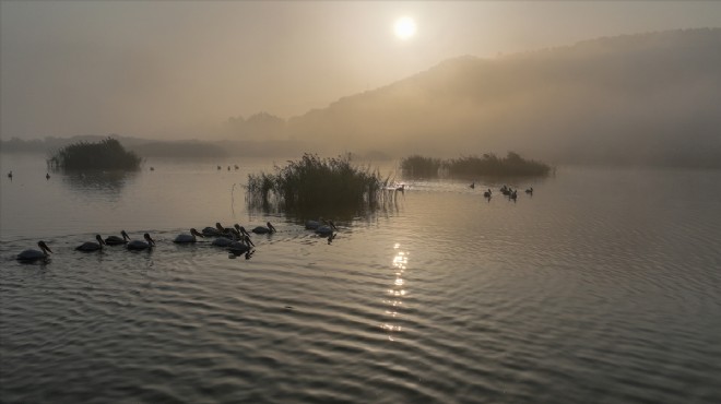 Küçük Menderes Havzası'nda yer alan ve çok sayıda kuş için barınma ve üreme alanı oluşturan Belevi Göl'nde ise sisle birlikte güzel bir görüntü oluştu. (AA)