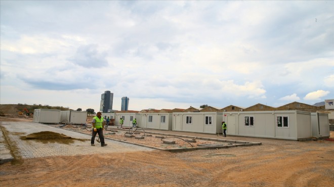 Bayraklı ilçesi Haydar Aliyev Caddesi'ndeki geçici barınma merkezinde, dün başlayan konteyner yerleştirme çalışmalarına bugün de devam edildi.