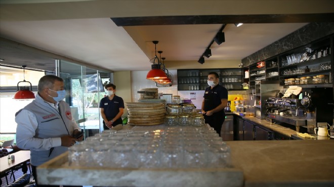 İl Müdürü Mustafa Özen'in katılımıyla Karşıyaka ilçesindeki Bostanlı Mahallesi'nde kafeterya ve restoran gibi gıda işletmelerde sosyal mesafe, hijyen ve maske kullanımı zorunluluğuna uyulup uyulmadığı denetlendi.