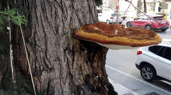 Sonbahar ile birlikte kendini göstermeye başlayan mantarlardan biri de Alsancak'taki, TCDD Misafirhanesi'ne ait otoparkın bahçesinde bir ağacın gövdesinde oluştu. Yaşlı bir çam ağacının gövdesinde kendiliğinden ortaya çıkan tepsi büyüklüğündeki mantar, görenleri şaşırttı.