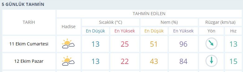 İzmir’de cumartesi günü (bugün) 25 derece olacak. Pazar günü ise sıcaklıklarda düşüş yaşanacak ve termometreler 22 dereceyi gösterecek. Gökyüzü çoğunlukla parçalı bulutlu ve güneşli olacak.