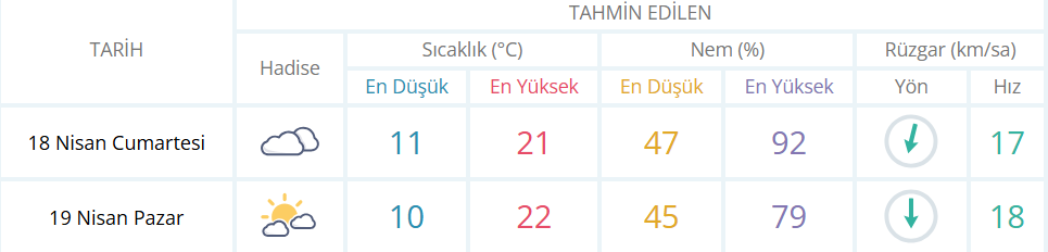 Tahminlere göre 19 Nisan Pazar günü (yarın) ise parçalı bulutlu ve 22 derece olacak. Bugün ve Pazar günü kentte yağmur yağışı beklenmiyor.