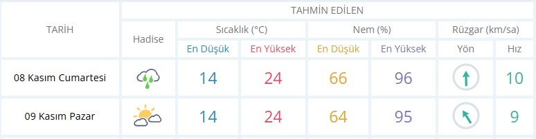 Kentte 8 Ekim Cumartesi sabahı sisli bir hava beklenirken hava sıcaklığı 24 derece olacak. Saat 12:00 ile 18:00 arasında ise yer yer sağanak yağış bekleniyor.