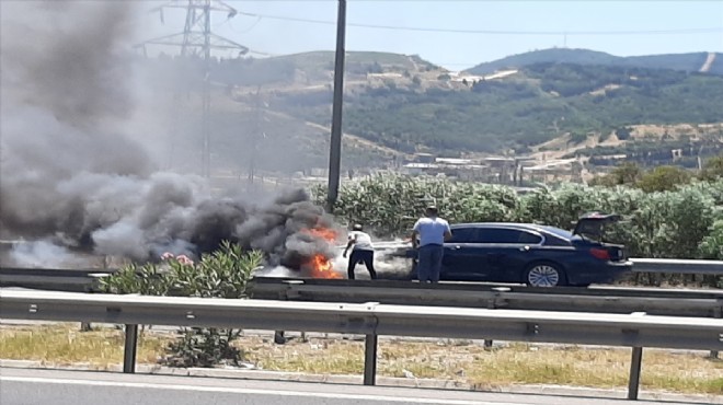 Aracı emniyet şeridine çeken sürücü, durumu itfaiye ve polis ekiplerine bildirdi. Araç, çevrede bulunanların yardımıyla söndürüldü.