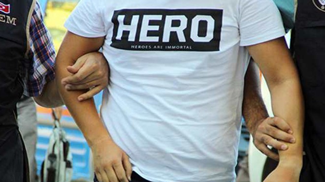 İZMİR - Cumhurbaşkanı Recep Tayyip Erdoğan'a suikast girişimi davası sırasında sanıklardan birinin İngilizce'de 'kahraman' anlamına gelen 'Hero' yazılı tişört giymesiyle başlayan süreçte, aynı tişörtten giyen onlarca kişi gözaltına alındı. Son olarak Aliağa'da bir lise öğrencisinin, üzerinde 'Hero' yazılı tişört giydiği yönündeki ihbar üzerine polis harekete geçti. Polis, tişörtü giyen lise öğrencisi T.T.'yi okula gelerek gözaltına aldı. Emniyete götürülen T.T., işlemleri sonrası sevk edildiği adliyede savcı tarafından serbest bırakıldı. (DHA)