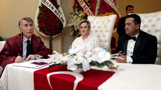 İzmir'de Güzelbahçe Müftüsü Alaattin Tosun, Volkan ve Havva Şahin çiftinin resmi nikahını kıydı.