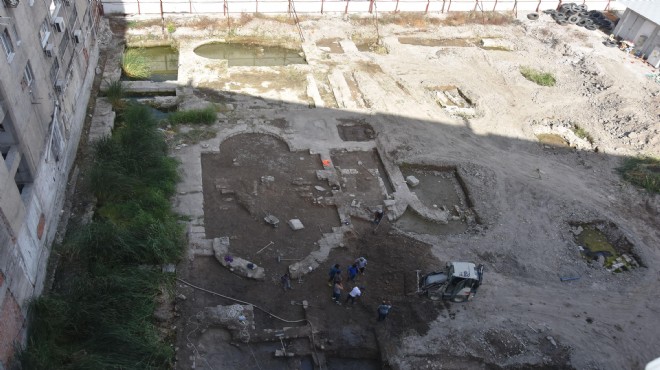 İş makineleriyle yapılan kazı çalışmaları sonrası binanın zemininde tarihi kalıntılara rastlanıldı. 3'üncü derece arkeolojik sit alanında kalan bölgede, inşaat çalışmaları durduruldu. İzmir 1 Numaralı Kültür Varlıklarını Koruma Bölge Kurulu'nun kararıyla bölgede sondaj yapılarak, kalıntılar incelenmeye başlandı. Aradan geçen 2 yıla rağmen çalışmalar bitirilemedi. Kültür Varlıklarını Koruma Bölge Kurulu'nca geçen aylarda yapılan toplantıda, bir kez daha karar alındı. Kurul tarafından taşınmaz üzerinde yapılan sondaj çalışmalarının incelendiği ve inceleme sonucu Roma dönemine ait liman hamam yapısı olduğu düşünülen kalıntıların ortaya çıktığı görüşü paylaşıldı. Kalıntıların, alanın diğer taraflarında da devam ettiği yönünde görüşün hakim olduğunu bildiren İzmir 1 Numaralı Kültür Varlıklarını Koruma Bölge Kurulu'nca söz konusu yapı kalıntılarının tümünün ortaya çıkarılabilmesi için Müze Müdürlüğü'nün uygun göreceği teknik ve yöntemlerle sondaj çalışmalarına parsel bütününde devam edilmesi yönünde karar alındı. Çalışmaların tamamlanmasının ardından Kazı Başkanlığı'nın görüşleri kurula iletilecek, ardından alanla ilgili nihai değerlendirme yapılacak.