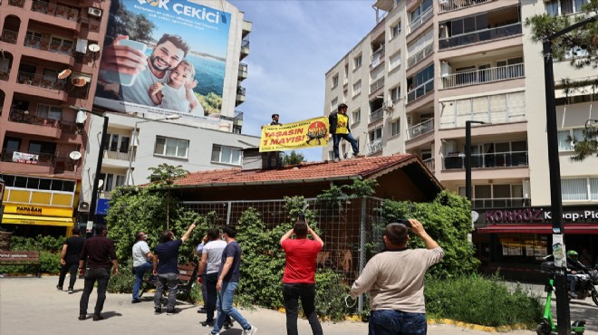 Bornova ilçesinde ise Küçükpark'taki bir trafonun üzerine çıkarak pankart açan ve slogan atan iki kişi, polisin müdahalesiyle yakalandı.