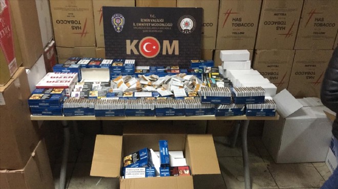 Konak'ta iki iş yeri ve bir depoda yapılan aramalarda kaçak olduğu belirlenen 22 bin makaron, 4 bin 300 sarma sigara, 9 bin 268 şişe kaçak alkollü içki, 2 bin 21 litre sahte etil alkol, 57 paket sigara bulundu.