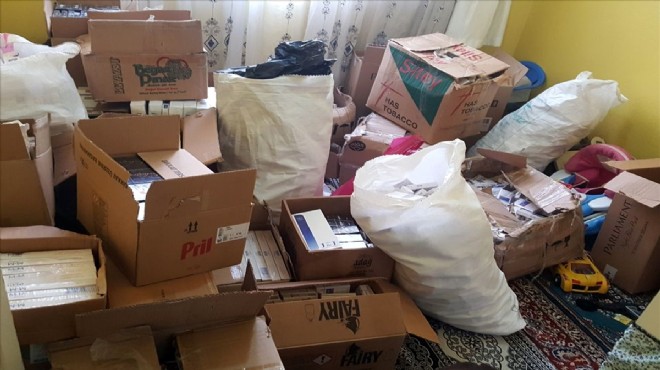 Bayraklı ve Konak ilçelerinde düzenlenen operasyonda, 18 bin 560 paket gümrük kaçağı sigara, 104 bin 200 tütün doldurulmuş makaron ile 312 paket nargile tütünü ele geçirildi.