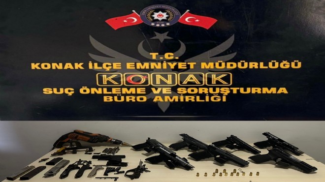 Konak İlçe Emniyet Müdürlüğü Suç Önleme ve Soruşturma Büro Amirliği ekipleri, ilçede bulunan 'Kuruçay' olarak bilinen Emir Sultan Mahallesindeki bir adreste kaçak silah üretildiği ve ticareti yapıldığı bilgisini aldı. İnceleme başlatan polis ekipleri söz konusu adresi teknik ve fiziki takibe aldı. Yapılan çalışmalar sonrasında ekipler atölyeye operasyon düzenledi. Adreste yapılan aramalarda 7 ruhsatsız tabanca, çok sayıda silah parçası ve silah yapımında kullanılan malzemeler ele geçirildi. Atölyede bulunan S.D. ve B.E. ve M.L. gözaltına alındı. Emniyette yapılan kimlik sorgulamasında, S.D. hakkında kesinleşmiş 12 yıl, B.E. hakkında ise 6 yıl kesinleşmiş hapis cezası olduğu ortaya çıktı. 2'si firari hükümlü 3 kişinin emniyetteki işlemlerinin ardından adliyeye sevk edileceği öğrenildi. (DHA)