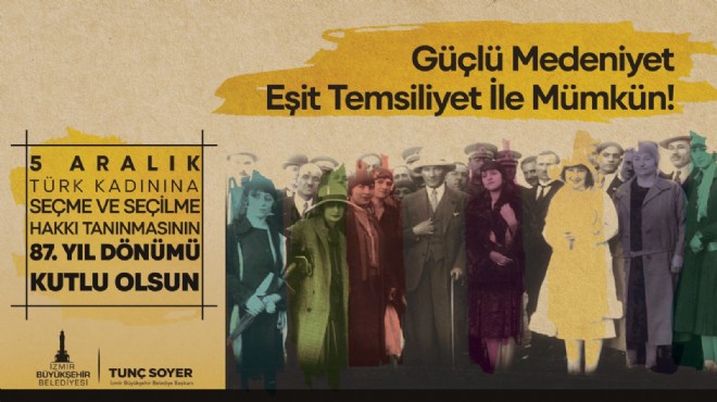 Büyükşehir Belediye Başkanı Tunç Soyer’in eşitlikçi politikaları ve “kadın dostu kent” vizyonu doğrultusunda 5 Aralık Pazar günü Türk kadınına seçme ve seçilme hakkı verilişinin 87’inci yılı İzmir'de bir dizi etkinlikle kutlanacak.