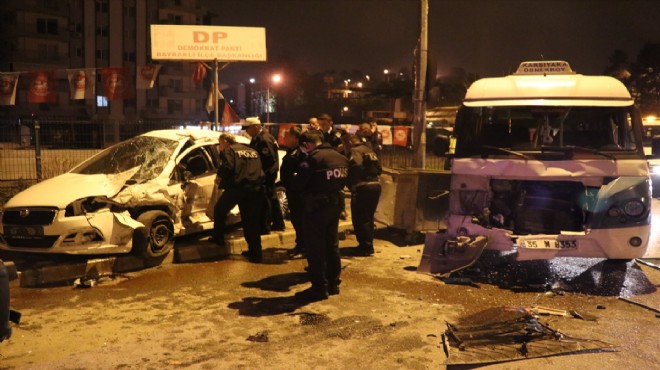 Bayraklı istikametinden Çiğli'ye seyreden Cevdet Ardıç (26) idaresindeki 34 UK 6945 plakalı otomobil, Anadolu Caddesi 10 Nisan Köprüsü yakınlarında park halindeki 35 M 8353 ve 35 S 00639 plakalı minibüslere çarptı.
