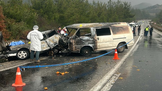 Kaza, saat 09.00 sıralarında Menderes-Gümüldür kara yolunda meydana geldi. 07 ZD 994 plakalı otomobil ile Ç.K.'nin kullandığı 35 SD 433 plakalı minibüs çarpıştı. Çarpışma sonrası otomobil alev aldı. Yanan otomobilde çıkamayan ve kimliği henüz tespit edilemeyen sürücü, hayatını kaybetti. Otomobilde bulunan M.Y. ile minibüste olan Ç.K. ve G.K. yaralandı. Yaralılar, ambulanslarla Menderes Devlet Hastanesi'ne kaldırılarak tedavi altına alındı. Ölen kişinin cansız bedeni ise otopsi için İzmir Adli Tıp Kurumu morguna kaldırıldı. Kaza ile ilgili soruşturma başlatıldı. (DHA)