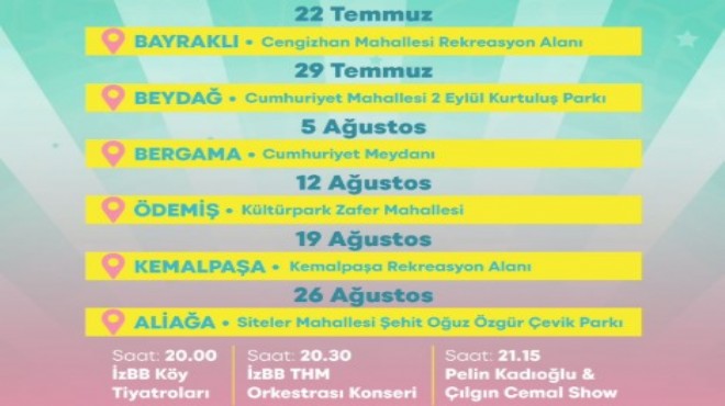 Şenlik kapsamında Bayraklı’da saat 20.00’de İzmir Büyükşehir Belediyesi Köy Tiyatroları ekiplerinin oyunları sahnelenecek. Saat 20.30’da Lokman Demirgıran & İzmir Büyükşehir Belediyesi Türk Halk Müziği Orkestrası Konseri ve 21.15’te ise Pelin Kadıoğlu & Çılgın Cemal Show sahnelenecek. Beydağ, Bergama, Ödemiş, Kemalpaşa ve Aliağa’da ise saat 20.00’de İzmir Büyükşehir Belediyesi Köy Tiyatroları ekiplerinin oyunları, saat 20.30’da Burak Maral & İzmir Büyükşehir Belediyesi Türk Halk Müziği Orkestrası Konseri ve 21.15’te ise Pelin Kadıoğlu & Çılgın Cemal Show olacak. Ücretsiz etkinliklerde yüz boyama, jonglör, palyaço, balon şişirme ve HİM Gezici Sahne etkinliklerinin yanı sıra çocuklar için kitap dağıtımı da yapılacak.