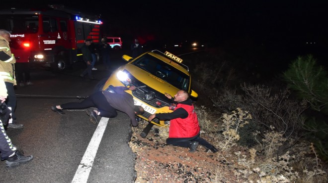 Asılı kalan taksi içerisinde bulunan D.A. ile anne ve babası, durumu 112 Acil Çağrı Merkezi'ne bildirdi. İhbar üzerine olay yerine polis, sağlık ve 110 AKS ekipleri yönlendirildi. Bölgeye gelen 110 AKS ekipleri, taksinin uçurumdan yuvarlanmaması için aracın lastiklerini halat yardımı ile bağlayarak önlem aldı. Yaklaşık 20 metrelik şarampole uçmaktan şans eseri kurtulan aile, kontrollü bir şekilde kurtarıldı. Olayda herhangi bir yaralanan olmazken, taksi ise çekicinin yaptığı çalışmalar sonucunda devrildiği yerden çıkarıldı.