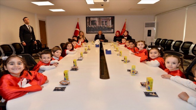 Gaziemir'de özel bir anaokulunun 6 yaşındaki öğrencileri, omuzlarına asılı Türk bayraklarıyla Şahne'yi makamında ziyaret etti.
