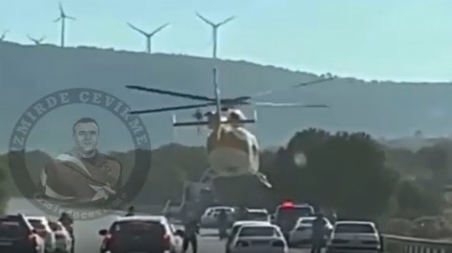 Çeşme Otoyolu'nun ortasına helikopter indi. Yol kenarındaki çakarlı araçtan inen 2 kişinin helikoptere bindiği görüldü. Helikopterin kime ait olduğu ve binenlerin kim olduğu ise bilinmiyor.