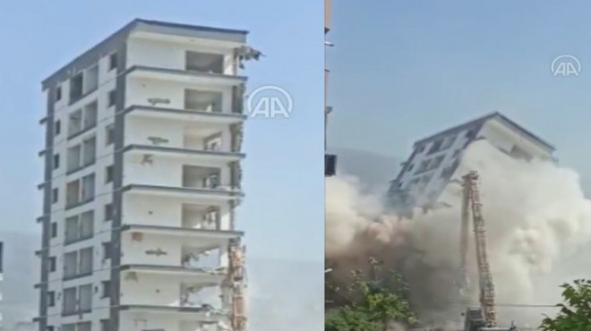 Ekskavatörün kirişlere müdahalesiyle bina bir anda çöktü. Çevre toz bulutuyla kaplandı.