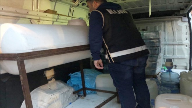 İzmir'de sahte içki imalathanelerine yönelik baskınlardan kurtulmak için yeni yöntemler geliştiren kaçakçılara yönelik operasyonlar kapsamında, özel olarak imalathaneye dönüştürülmüş bir minibüs ele geçirildi.