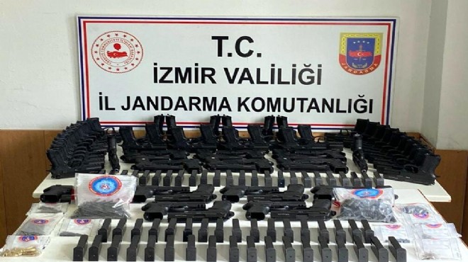 İl Jandarma Komutanlığı Kaçakçılık ve Organize Suçlarla Mücadele ile İstihbarat Şubesi ekipleri, Karabağlar'da bir depoda çok sayıda ruhsatsız silah bulunduğu bilgisi sonrası harekete geçti. Teknik ve fiziki takibin ardından depoya baskın yapıldı. Operasyonda 64 ruhsatsız tabanca, 63 şarjör, 15 mermi ve muhtelif tabanca parçaları ele geçirildi, B.E. ve H.E. gözaltına alındı. (DHA)