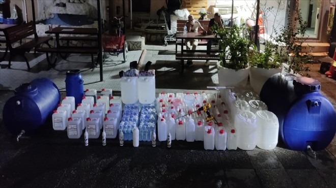 Evde yapılan aramada 115 litre sahte içki ve 85 litre etil alkol, 250 litrelik fiber tank, 150'şer litrelik iki fiber tank, 50 litrelik fiber fıçı, farklı boyutlarda 3 huni, cam tüp, derece, 5 sıvı renklendirici, metal karıştırıcı, çok sayıda boş pet şişe ve bidon ele geçirildi.
