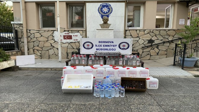 İzmir'in Bornova ilçesinde, sahte içki satışı yapılan bir kokoreç dükkanına ve iş yeri sahibinin diğer adreslerine düzenlenen operasyonda, çok miktarda etil alkol ele geçirildi.