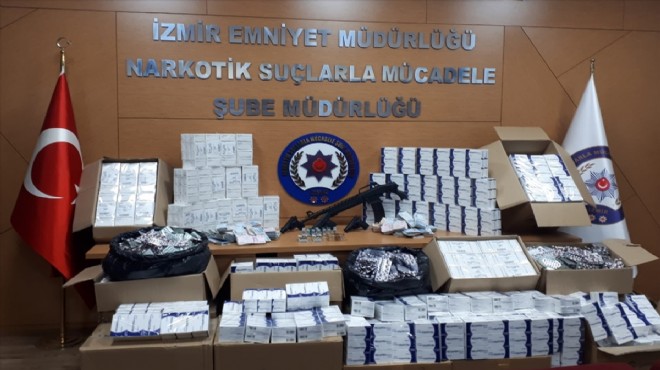 Bornova ilçesinde belirlenen adres ve 2 araçta gerçekleştirilen aramalarda, kırmızı ve yeşil reçeteye tabi 174 bin 958 sentetik ecza, 3 tabanca, 1 tüfek, 4 şarjör, 113 mermi ele geçirildi.