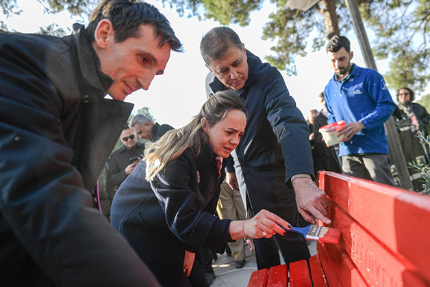 8 Mart Dünya Kadınlar Günü kapsamında İzmir Büyükşehir Belediyesi ve İzmir İtalya Konsolosluğu iş birliğiyle Kültürpark’ta kırmızı bank farkındalık çalışması gerçekleştirildi. İtalya’da kadınlara yönelik şiddet ve cinayetlere karşı farkındalık yaratmak amacıyla başlatılan bu sembolik uygulamada, kırmızıya boyanan banklar şiddet nedeniyle yaşamını yitiren kadınların yokluğunu hatırlatıyor ve kamusal alanlarda dayanışma mesajı veriyor. Zamanla uluslararası bir farkındalık kampanyasına dönüşen uygulamada İzmir Büyükşehir Belediye Başkanı Dr. Cemil Tugay ve eşi Öznur Tugay, İzmir İtalya Konsolosu Daniele Bianchi ile birlikte iki bankı kırmızıya boyadı ve kadına şiddete karşı mesaj verdi. Programa, İzmir Büyükşehir Belediyesi Başkan Vekili Dr. Zafer Levent Yıldır, İzmir Büyükşehir Belediyesi Genel Sekreter Yardımcısı Prof. Dr. Pınar Okyay ve yurttaşlar katıldı.