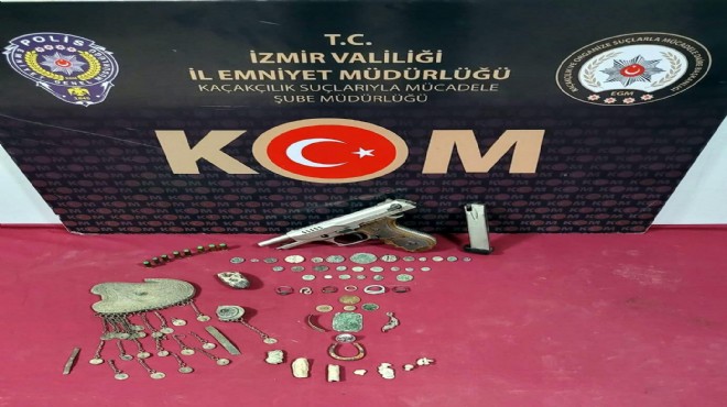 İl Emniyet Müdürlüğü Kaçakçılık Suçlarıyla Mücadele Şube Müdürlüğü ve Tire İlçe Emniyet Müdürlüğü ekipleri, yapılan teknik ve fiziki takibin ardından 3 ev ve 2 iş yerine operasyon düzenledi. Adreslerde yapılan aramalarda Helenistik, Roma, Bizans ve İslami dönemlere ait 459 sikke, 239 obje, 17 metal ok ucu, 25 yüzük, 1 kama, 1 taş balta, 1 kemer tokası, 1 kurşun mühür, 1 kurusıkıdan bozma tabanca ve 8 ait mermi ele geçirildi. Olayla ilgili G.Ü., Ü.B. ve O.Y. gözaltına alındı.