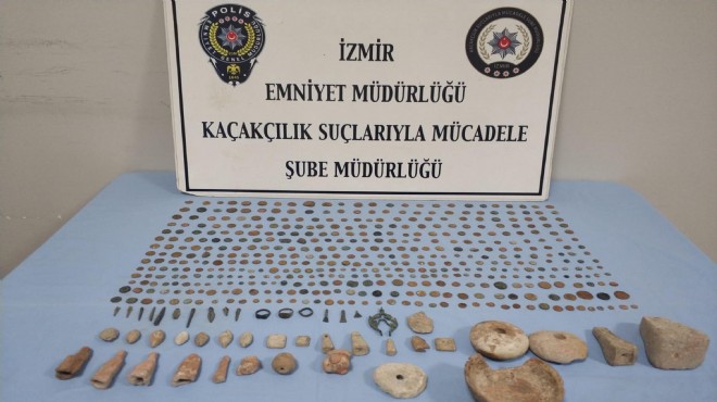 İzmir Emniyet Müdürlüğü Kaçakçılık Suçlarıyla Mücadele Şubesi ekipleri, A.Ö. isimli kişinin elindeki tarihi eserleri satmaya çalıştığı bilgisine ulaştı. Yapılan teknik ve fiziki takibin ardından polis, A.Ö.'nün Aliağa ilçesindeki evine operasyon düzenledi. Evde yapılan aramada, Roma, Bizans, Osmanlı dönemlerine ait farklı ebatlarda 450 sikke, 10 bronz ok ucu, 3 bronz yüzük, 7 sapan taşı, 8 pişmiş toprak insan tasvirli figür, eski dönemlerde mimaride dikey olarak düzgün yapılar inşa etmek için kullanılan 12 ağırlık, 5 metal obje ve 1 pişmiş toprak sunum kabı ele geçirildi. Gözaltına alınan A.Ö. sorgulanmak üzere emniyete götürüldü. (DHA)