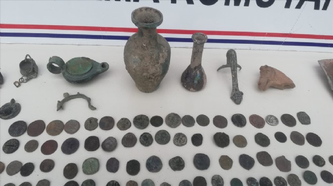İl Jandarma Komutanlığı KOM Şube Müdürlüğü ile Torbalı İlçe Jandarma Komutanlığı ekiplerince bir araca düzenlenen operasyonda Klasik, Helenistik, Roma, Bizans, Selçuklu ve Osmanlı dönemine ait 499 sikke, tablet, 30 obje, 4 haç, 4 heykel, 2 vazo, kandil, 8 madalyon, 3 ok ucu, mühür, 3 kolye ucu, 16 yüzük ve 3 bilezik olmak üzere 575 tarihi eser ele geçirildi.