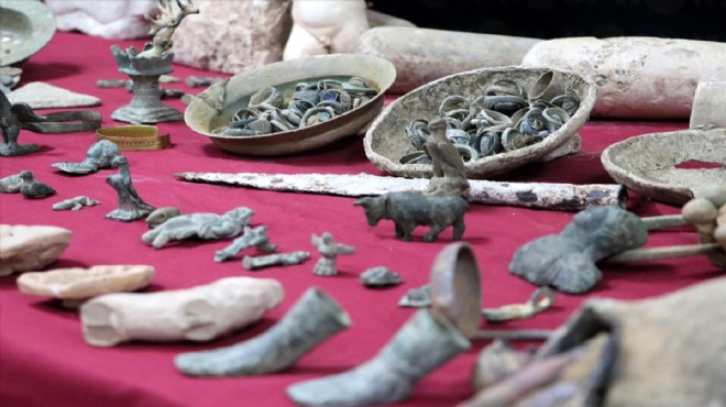Dün İzmir'in Menemen ile Manisa'nın Salihli ve Turgutlu ilçelerindeki operasyonda yaklaşık 70 bin parça tarihi eser ile 70 bin dolar ve 11 bin avro ele geçirilmiş, 7 kişi gözaltına alınmıştı. (AA)
