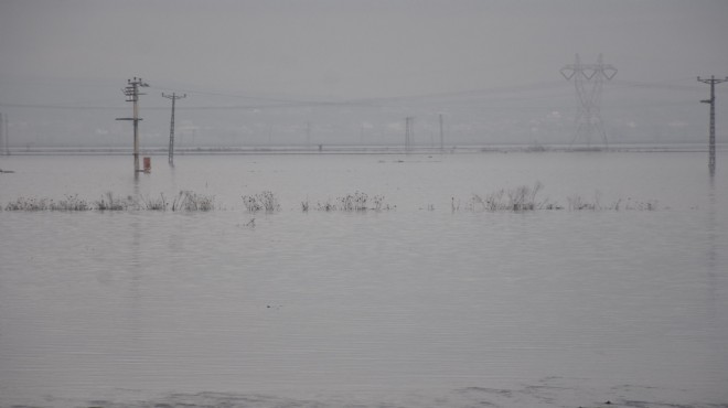 İzmir'de Cuma gününden beri etkili olan sağanak yağış nedeniyle tarım arazileri sular altında kaldı. Küçük Menderes Nehri'nde taşkınlar, arazileri göle çevirdi. Havadan da görüntülenen arazilerde bulunan elektrik direkleri, suyun yükselen seviyesini gözler önüne serdi.