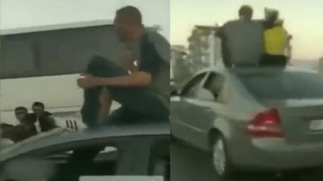 İzmir Çevreyolu Karşıyaka mevkiinde 09 LZ 840 plakalı araçta yolculuk yapan kimliği belirlenemeyen iki kişi, otomobil seyir halindeyken sanruf bölümüne çıkarak yolculuk yaptı. Aracın üzerinde oturanlardan birisi, direksiyonu tek ayağıyla idare etti. Tehlikeli yolculuk başka bir sürücü tarafından cep telefonuyla kaydedildi. Video çeken vatandaşın 'Harikasınız' demesi de görüntülerde yer aldı.(DHA)