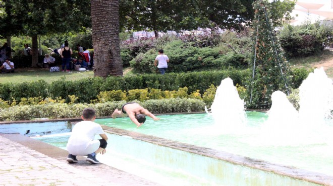 İzmir’in Konak Meydanı'ndaki tarihi Saat Kulesi'nin yanında bulunan süs havuzlarına girip, hayatlarını hiçe sayarak serinlemeye çalışan çocuklar, elektrik çarpma tehlikesinin yanı sıra hijyen olmayan sudaki mikroplarla da temas ediyor. (DHA)