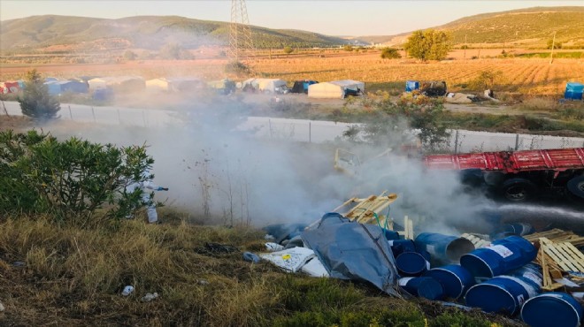 İzmir'in Torbalı ilçesinde bir kamyonun trafik kazası sonucu devrilmesinin ardından kasasındaki varillerden çevreye yayılan kimyasal sıvılar için arındırma çalışması yapıldı.