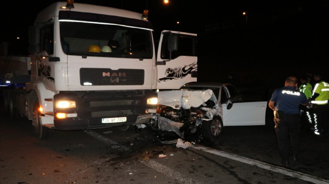 Alınan bilgiye göre, Karşıyaka-Bornova çevre yolunun Bayraklı tünelleri çıkışında Ömer Altuntabaklı'nın kullandığı 34 CAE 235 plakalı otomobil, beton blok taşıyan ve sürücüsü Kamuran Y. olan 06 AP 7005 plakalı tıra arkadan çarptı.