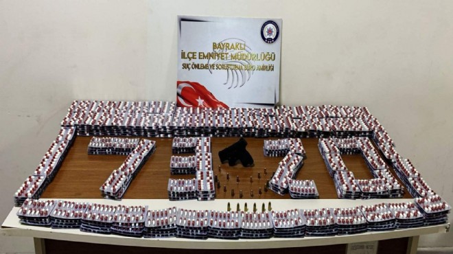 Bayraklı İlçe Emniyet Müdürlüğü Suç Önleme ve Soruşturma Büro Amirliği ekipleri, istihbarat çalışmasıyla, Gümüşpala Mahallesi'nde yaşayan Onur Mavanacı'nın evinde ve iş yerinde uyuşturucu madde bulundurup, sattığını belirledi. Dün, şüphelinin ev ve iş yerine operasyon düzenlendi. Yapılan aramalarda 6 bin 823 sentetik hap, 9 sarı ve yeşil renkli uyuşturucu olduğu değerlendirilen hap, 1 tabanca, 2 şarjör, 24 mermi, 10 dolu kartuş ele geçirildi. Onur Mavanacı, gözaltına alındı. Polisteki işlemlerinin ardından adliyeye sevk edilen Manavacı, çıkarıldığı mahkemece tutuklandı. (DHA)