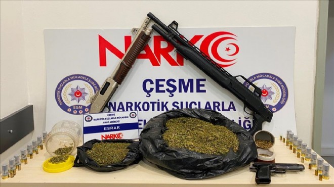 İzmir'in Çeşme ilçesinde yapılan operasyonda 1,5 kilogram esrar, iki tüfek, bir tabanca ve 38 mermi ele geçirildi, bir kişi tutuklandı.