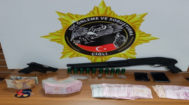 Adreste yapılan aramada bir miktar esrar ile 1 tabanca, 1 pompalı tüfek, 3 fişek ve 10 kartuş ve uyuşturucu ticaretinden elde edildiği değerlendirilen 66 bin 200 lira, 275 dolar, 60 sterlin ve 120 avro ele geçirildi.