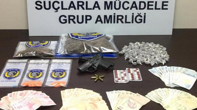Aliağa Emniyet Müdürlüğü'ne bağlı Narkotik Suçlarla Mücadele Grup Amirliği ekipleri, Foça'daki evde uyuşturucu madde satışı yapıldığı ihbarı üzerine harekete geçti. Çalışma başlatan ekipler, söz konusu adrese operasyon düzenledi. Operasyonda, A.Y. (22), E.A. (17) , E.A. (20), T.E. (20), İ.B.D. (19), M.Ç.(22), E.A. (19) ve Ö.Ç. (19) gözaltına alınırken, evde yapılan aramada ise 500 gram esrar maddesi, 101 satışa hazır halde fişek tabir edilen esrarlı sigara, 65 ecstasy hap, 28 lilika diye tabir edilen hap, silah, silaha ait mermiler ve bir miktar para ele geçirildi. Şüpheliler sorgulanmak üzere emniyete götürüldü. Emniyetteki işlemlerinin ardından adliyeye sevk edilen E.A. ve Ö.Ç. serbest bırakılırken, A.Y., T.E. ve E.A. ise tutuklandı. Diğer şüphelilerin emniyetteki işlemlerinin devam ettiği öğrenildi.