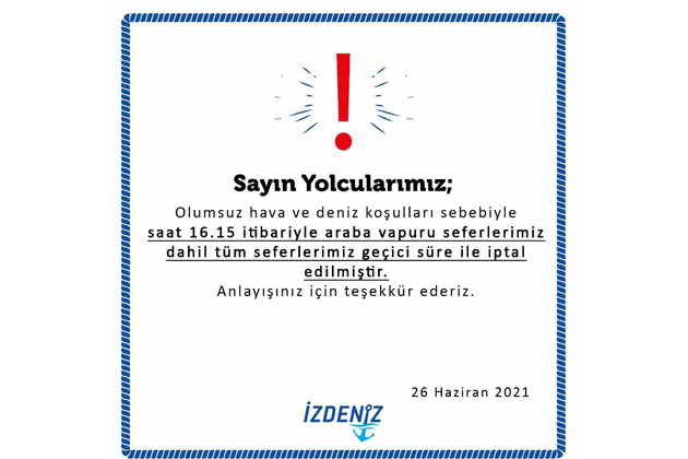 İZDENİZ'den yapılan açıklamada, saat 16.15'ten itibaren yolcu vapuru seferlerinin geçici süreyle iptal edildiği bildirildi.