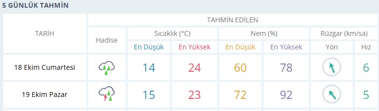 Pazar günü ise gökgürültülü sağanak yağış etkili olacak. Hav sıcaklığı ise 23 derece olacak. Hafta sonu boyunca gece sıcaklıkları ise 14 ve 15 derece olacak.