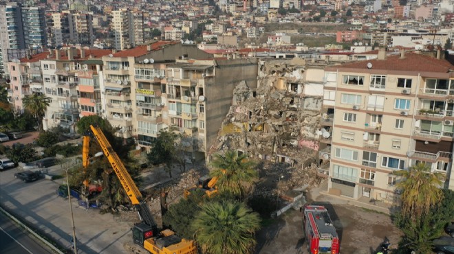 İzmir'in Bayraklı ilçesinde yan yattığı tespit edilerek şubat ayında tahliye edilen binada yıkım çalışmaları başladı.