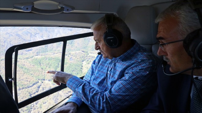 Yıldırım, İzmir Valisi Erol Ayyıldız ve Tarım ve Orman Bakan Yardımcısı Mehmet Hadi Tunç ile yangında zarar gören bölgeyi helikopterle havadan inceledi.