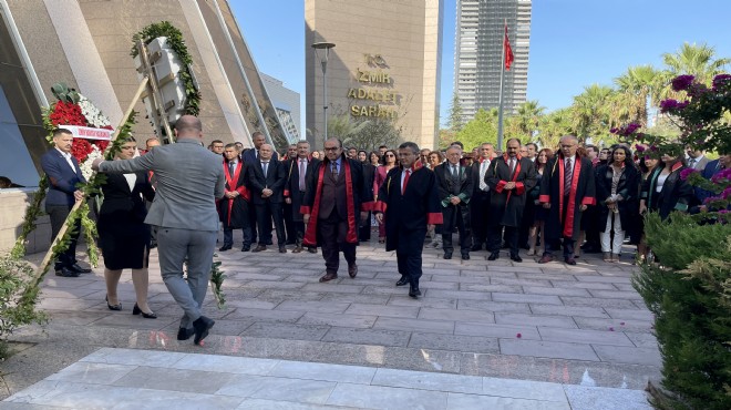 İzmir Adliyesi önündeki törende Cumhuriyet Başsavcısı Fahri Mutlu Tosun, Adli Yargı Adalet Komisyon Başkanı Oktay Tabur ve Baro Başkanı Sefa Yılmaz, Atatürk Anıtı'na çelenk sundu. Çelenklerin sunulmasının ardından saygı duruşunda bulunuldu, İstiklal Marşı okundu.