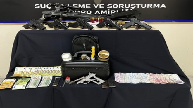 Bayraklı İlçe Emniyet Müdürlüğü Suç Önleme ve Soruşturma Büro Amirliği ekipleri, ilçedeki bir adreste çok sayıda silah bulunduğu ve uyuşturucu madde ticareti yapıldığı yönünde bilgi aldı. Bunun üzerine, söz konusu adresi teknik ve fiziki takibe alan polis, yapılan çalışmalar sonrasında savcılık talimatı ile adrese saat 05.00 sıralarında baskın düzenledi.