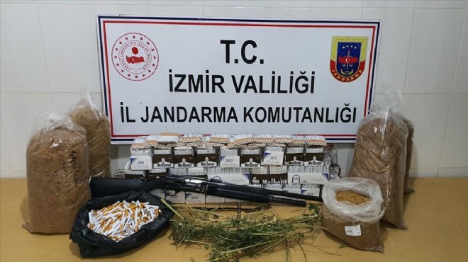 Adreslerde arama yapan ekipler, 1081 kök Hint keneviri, 284 gram kubar esrar, 21 bin 302 kilogram kıyılmış kaçak tütün, 10 bin 812 doldurulmuş makaron ve ruhsatsız av tüfeği ele geçirdi.